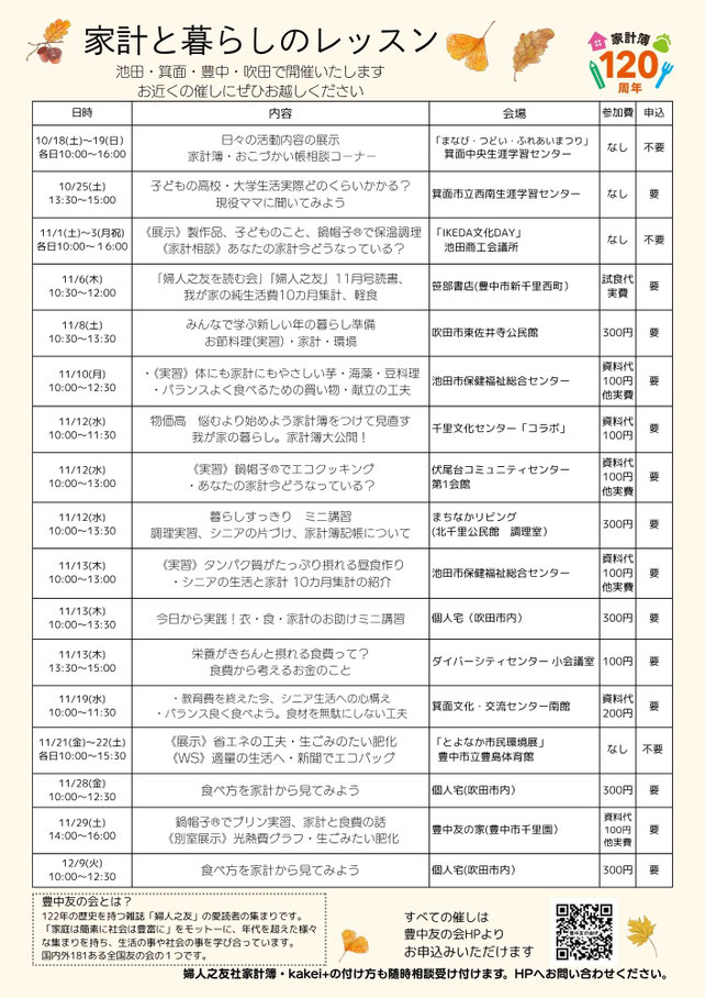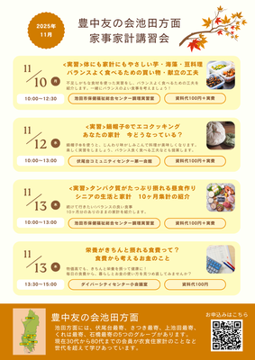 11月10日から13日は市内のコミセンなどで食事作りの実習を交えた学びの場、こじんまりした集まりで予約が必要です。