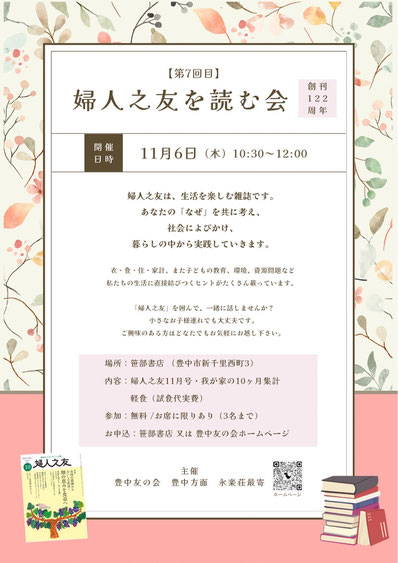 豊中友の会は、大阪北部地域、豊中、池田、箕面、吹田に住む20才代から100才代までの約160人で活動しています。『婦人之友』読者の集まり、自主自立の女性団体です。